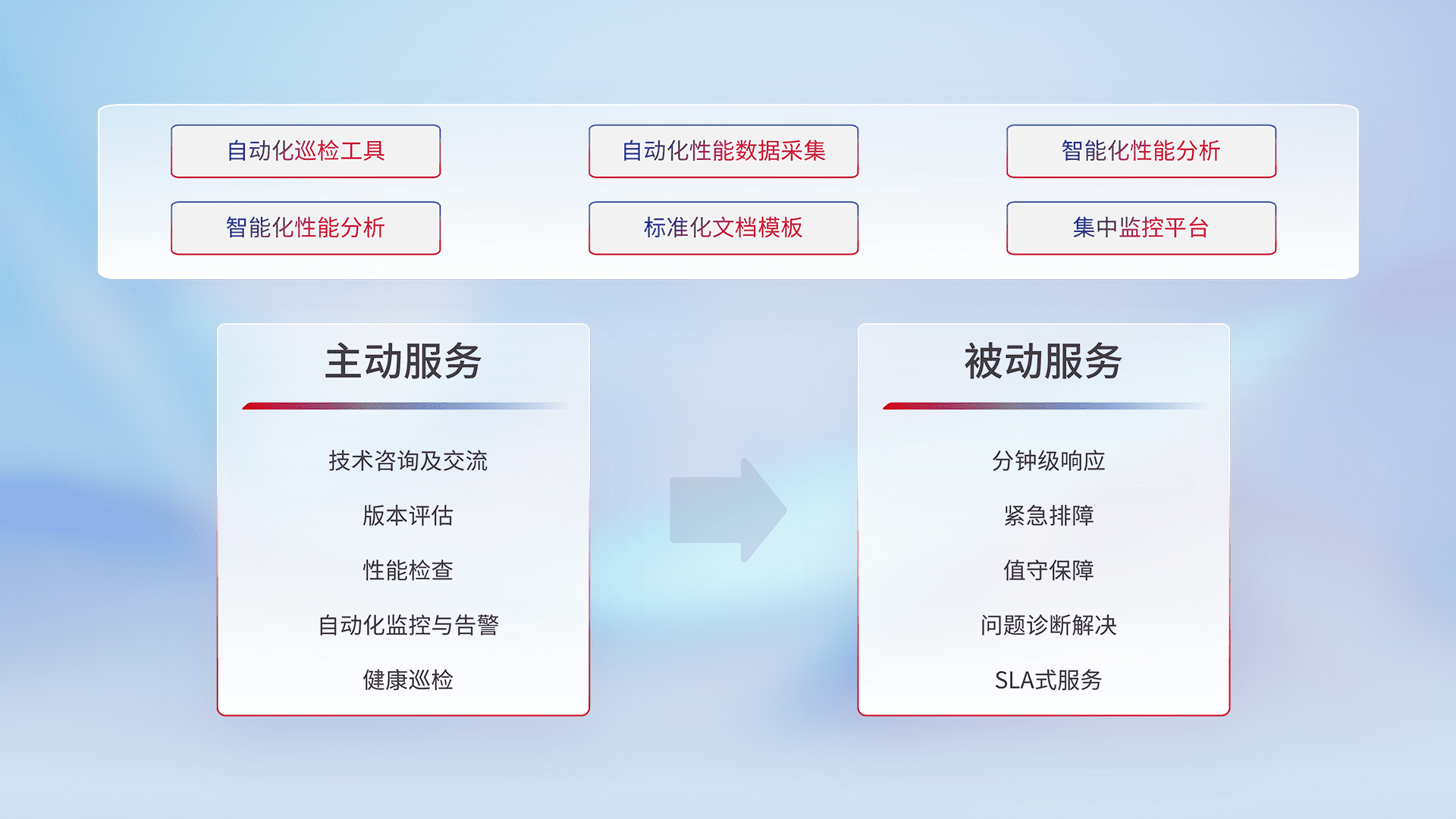 智能化工具和标准化文档,,保障服务质量,,,,提供主动服务(包含技术咨询、、版本评估、、、、性能检查、、自动化监控与告警、、、健康巡检)和被动服务包含(分钟级响应、、紧急排障、、、、值守保障、、、、问题诊断解决、、、、SLA服务)。。。